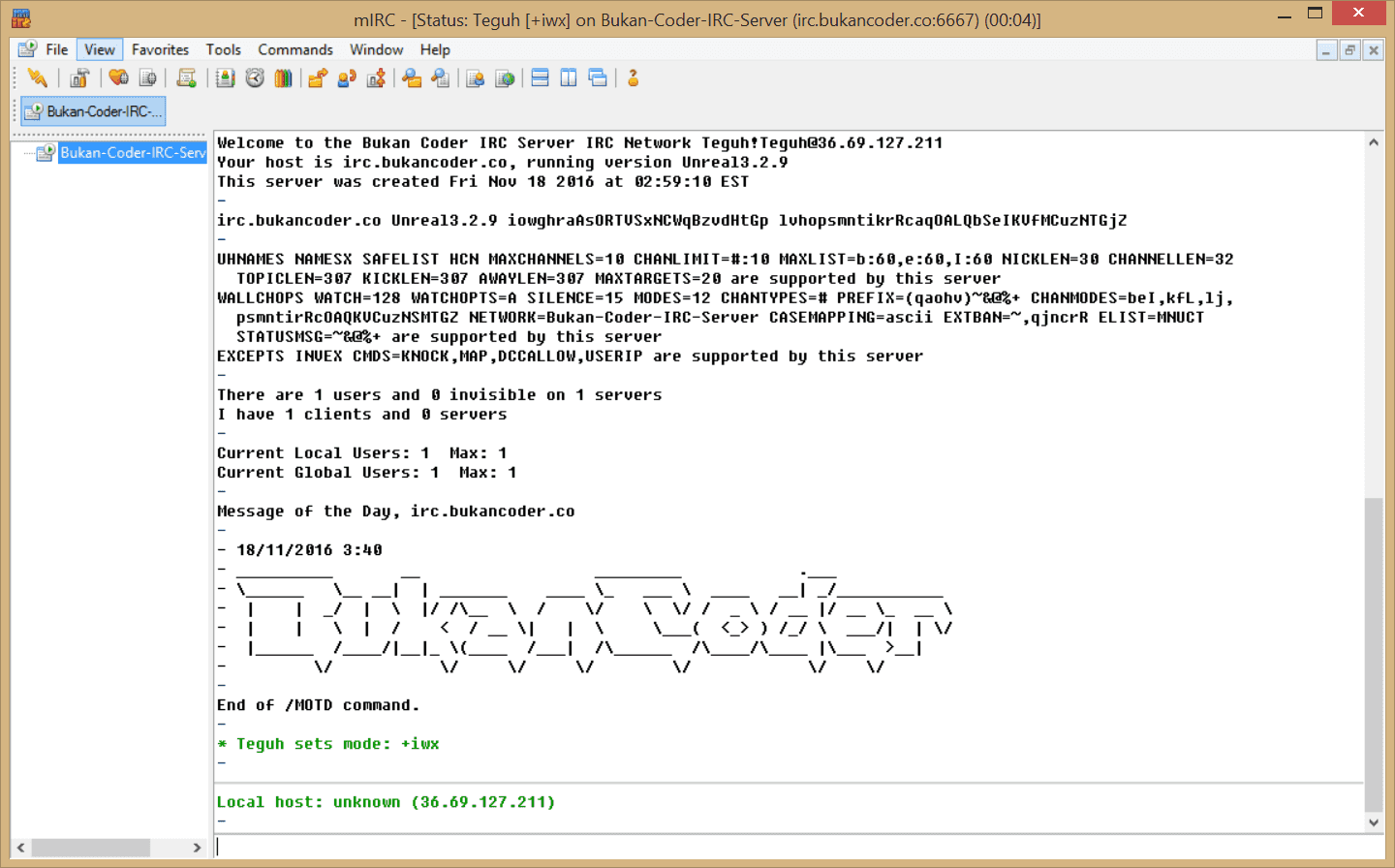 ./unreal startCoba akses server Anda melalui mIRC. Jika sukses maka tampilannya akan seperti ini :