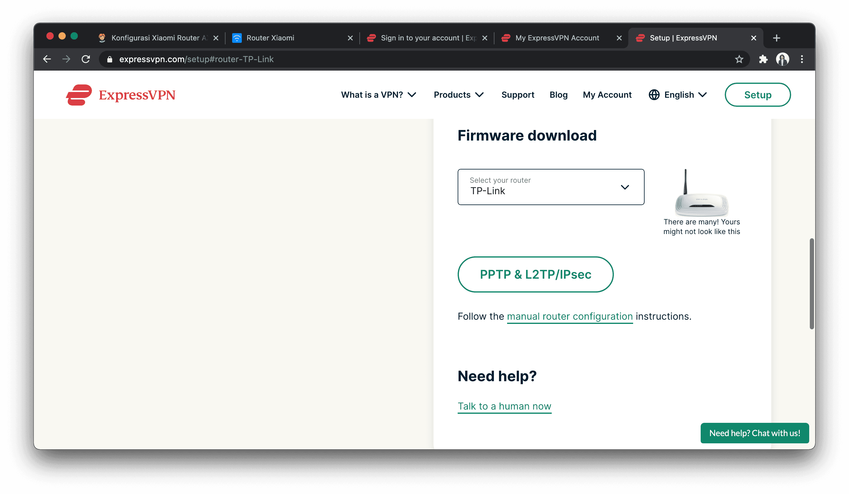 Login ke ExpressVPN melalui browser kemudian akses link berikut https://www.expressvpn.com/setup#router-TP-Link, lalu klik tombol PPTP & L2TP/IPSEC.