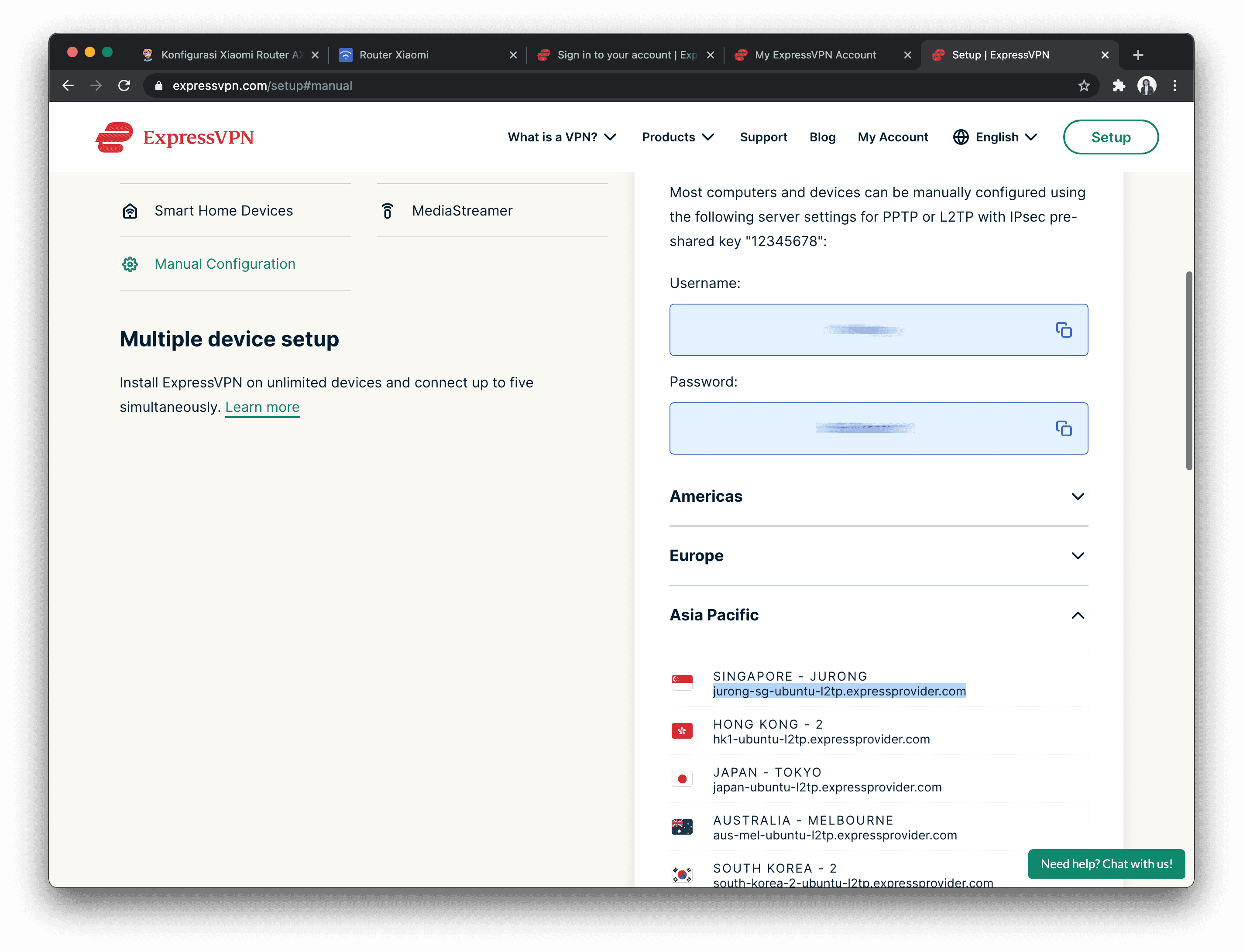 Untuk manual configuration, ExpressVPN tidak menyediakan lokasi VPN yang di Indonesia, Indonesia hanya tersedia di versi yang aplikasi. Jadi yang saya gunakan adalah VPN yang Singapore. Setelah kamu klik tombol PPTP & L2TP/IPSEC akan muncul halaman yang berisi username dan password kamu dan juga informasi server yang bisa kamu gunakan. Pilih yang Asia Pasific.