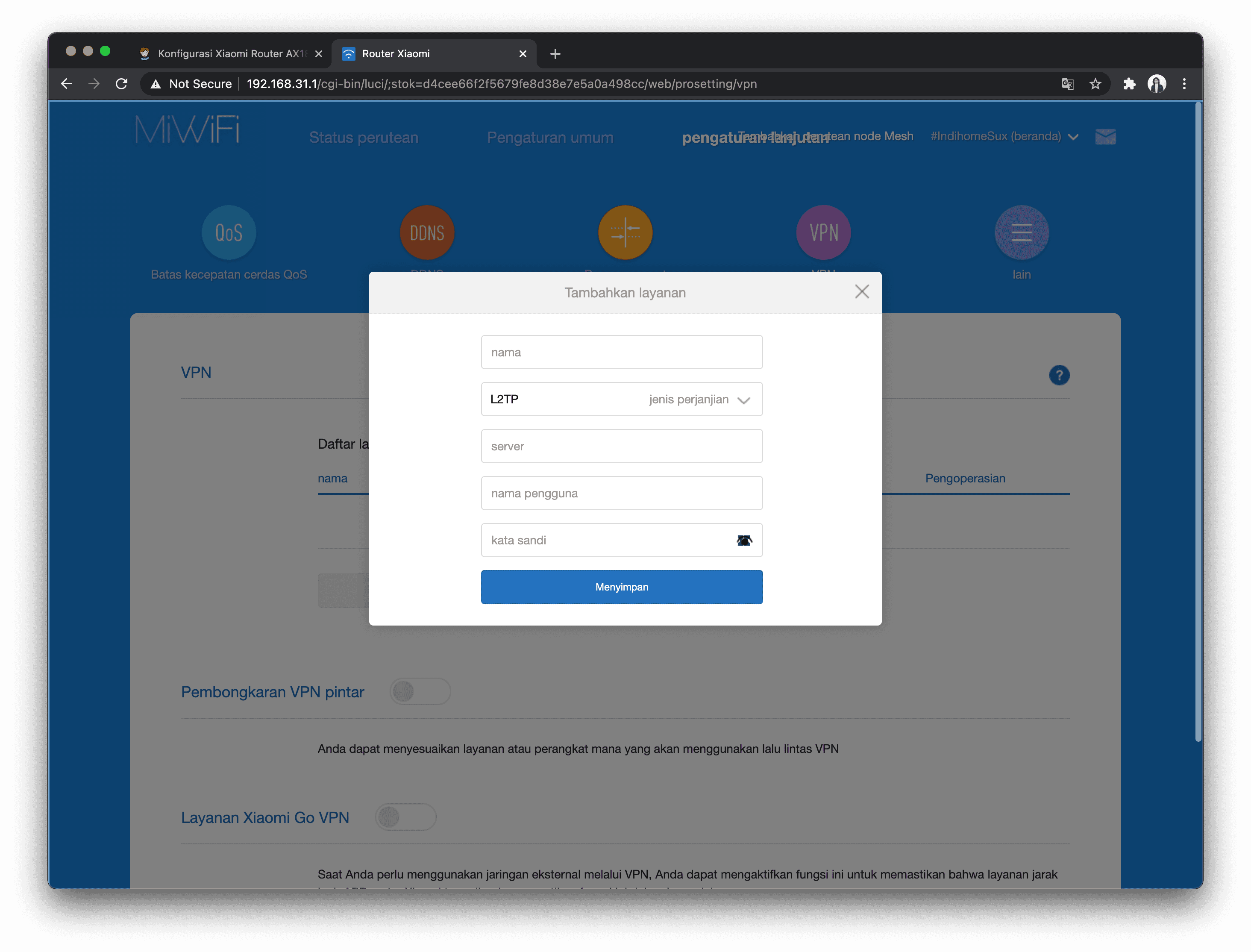 Kembali lagi ke router, lalu sesuaikan seperti berikut dan klik simpan :