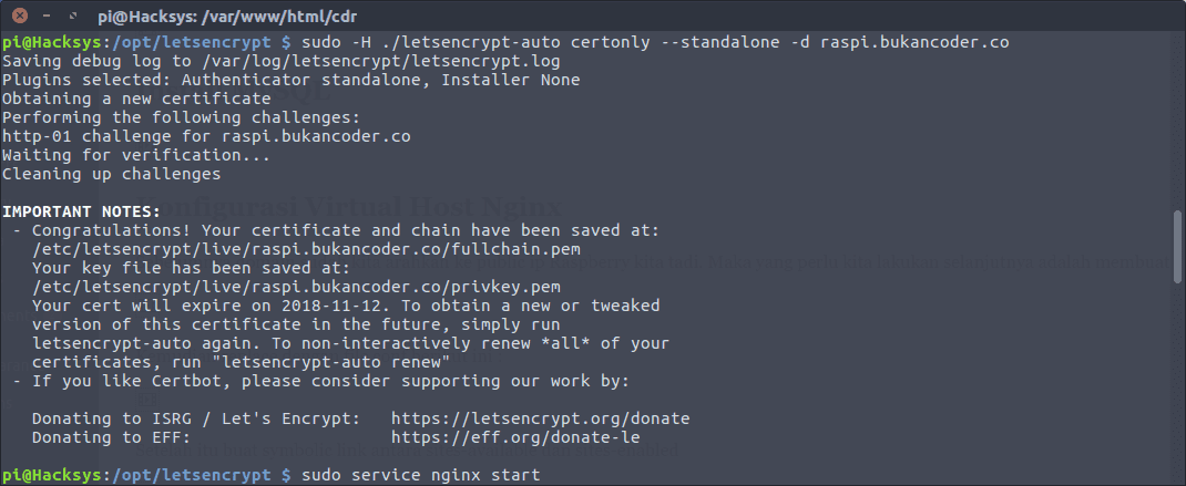 sudo -H ./letsencrypt-auto certonly --standalone -d raspi.bukancoder.coJika proses issue SSL telah berhasil, maka akan muncul output seperti ini :