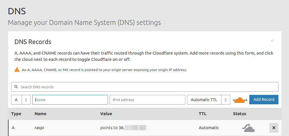 Selanjutnya yang perlu kita lakukan adalah mengarahkan domain atau subdomain yang akan kita gunakan ke public IP yang telah kita dapatkan tadi. Buatlah A record yang kemudian diarahkan ke public IP kita tadi :