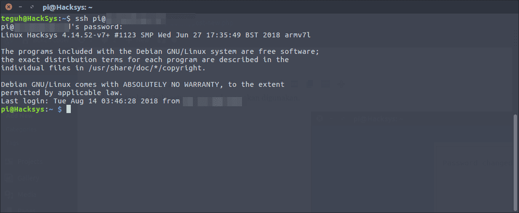 ssh pi@PublicIPKamu 22Silahkan replace @PublicIPkamu dengan IP public sesuai dengan punya kita masing-masing dan login menggunakan password yang sudah kita set tadi. Jika berhasil maka tampilannya akan seperti ini :