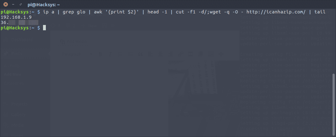 ip a | grep glo | awk '{print $2}' | head -1 | cut -f1 -d/;wget -q -O - http://icanhazip.com/ | tailAkan muncul output seperti ini :