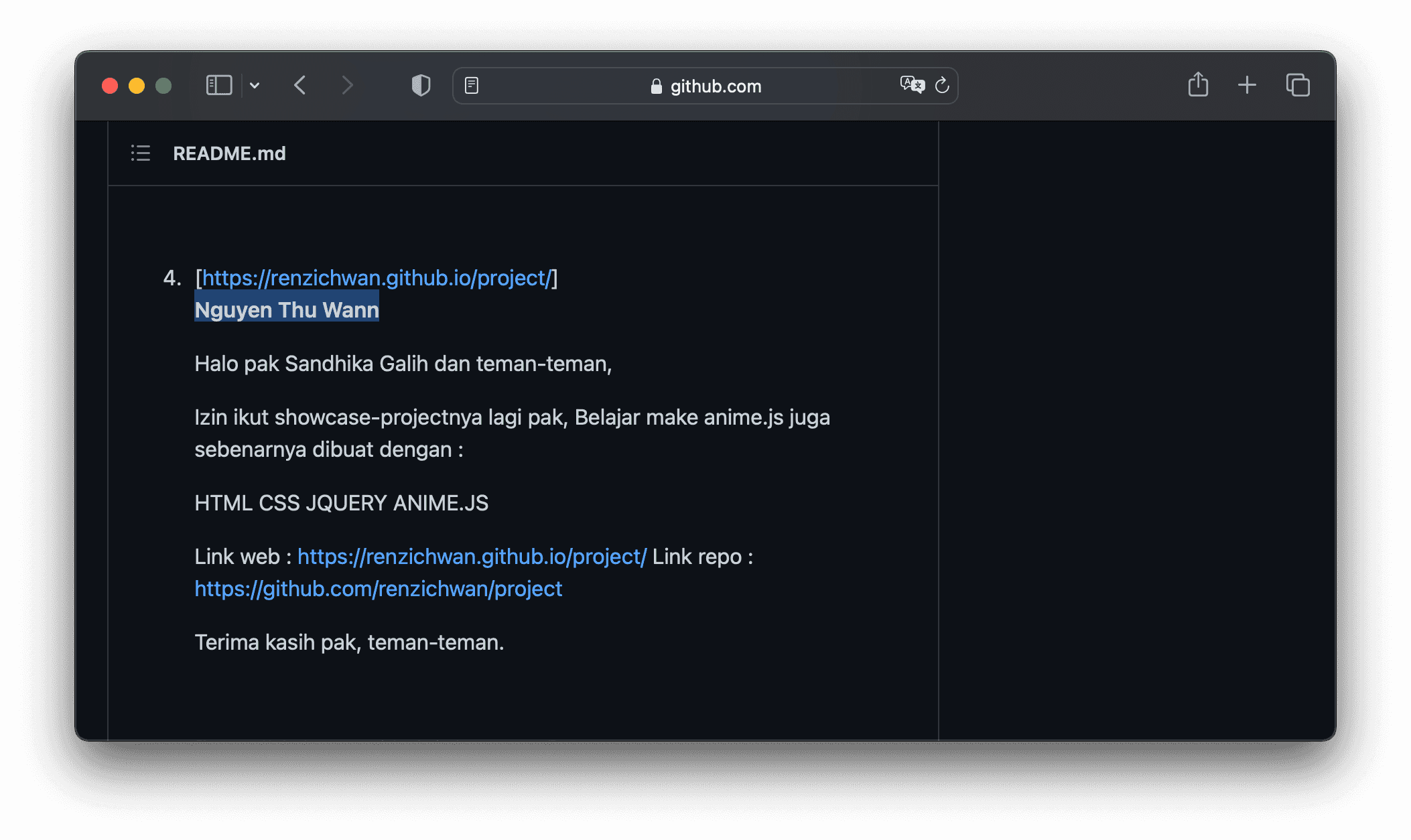 Terduga pelaku juga pernah mengirimkan karyanya ke Pak Sandhika Galih melalui Discord Web Programming Unpas. Bisa diakses melalui https://github.com/sandhikagalih/project-kalian