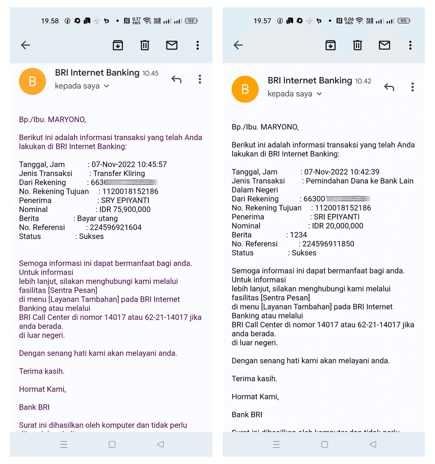 Langkah cepat yang dilakukan Pak Maryono berhasil mencegah uangnya dikuras lebih banyak oleh sang pelaku. Pak Maryono menerima SMS yang berisi kode OTP sebanyak 6 kali dan hanya 2 kode OTP yang berhasil didapatkan oleh pelaku untuk melakukan 2 transaksi. Transaksi yang pertama sebesar Rp. 20.000.000 dan yang kedua sebesar Rp. 75.900.000. Total uang miliki Pak Maryono yang digondol oleh pelaku sebesar Rp. 95.900.000.