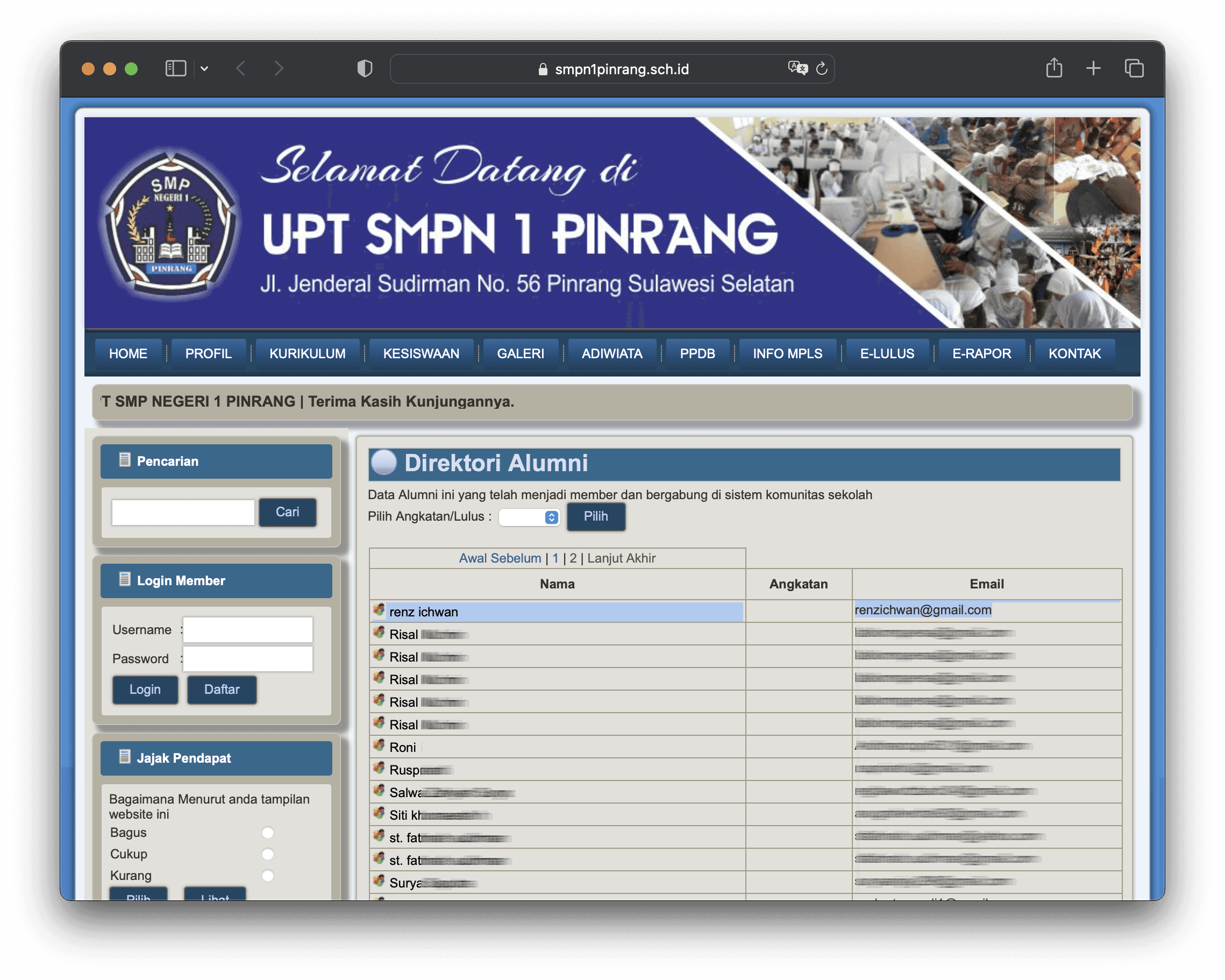 Informasi terduga pelaku di halaman Daftar Alumni UPT. SMP NEGERI 1 PINRANG. Bisa diakses melalui https://www.smpn1pinrang.sch.id/alumni.php?id=data&tahun=&hal=2