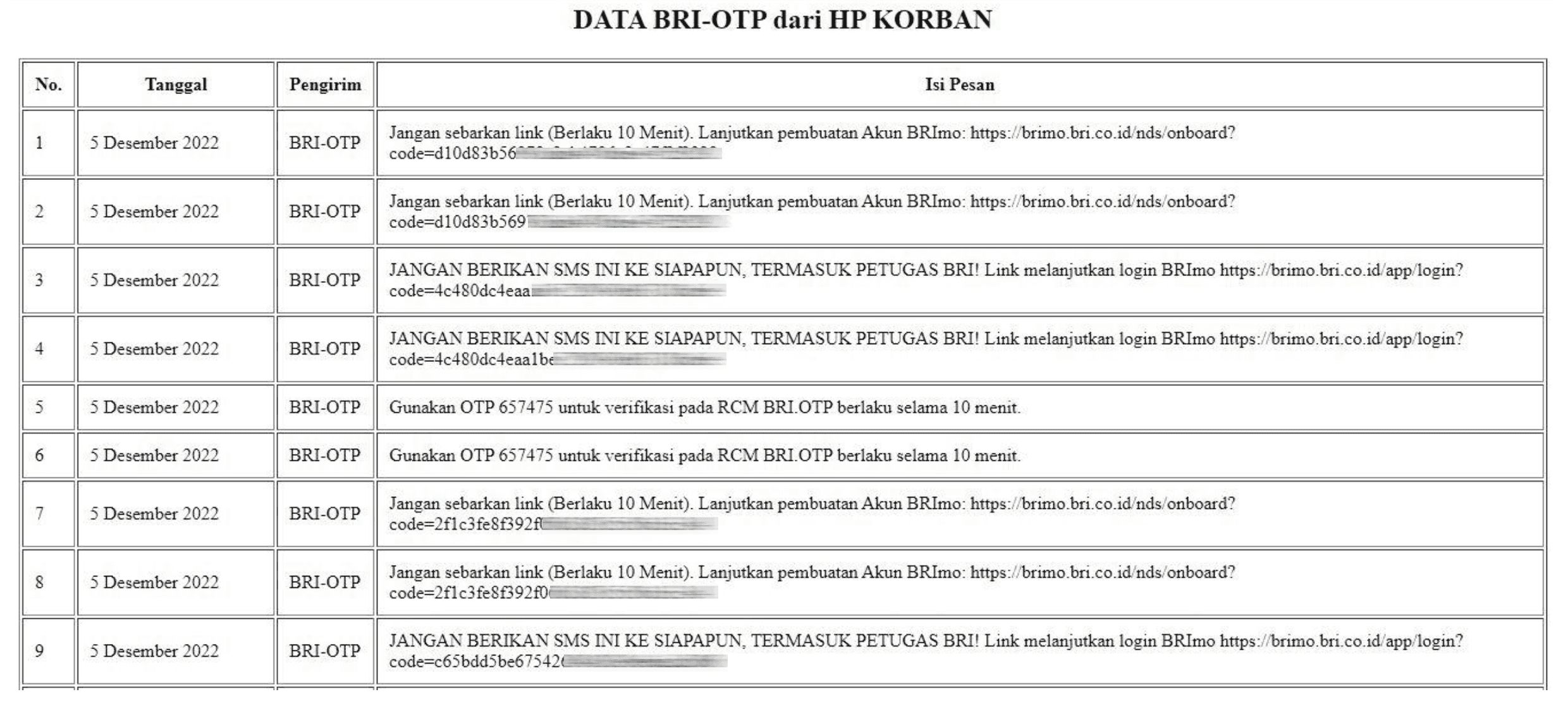 Berikut adalah tampilan log SMS terkait BRIMO dari beberapa korban di server yang digunakan oleh pelaku:
