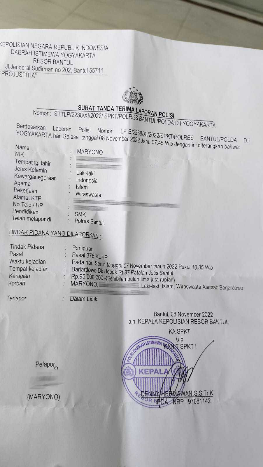Esok harinya pada 8 November 2022 Pak Maryono melaporkan kasus yang baru saja dialaminya ke Polres Bantul. Laporan telah diterima oleh Polres Bantul dan sudah dilakukan pemanggilan saksi diantaranya adalah Istri dari Pak Maryono dan juga Kepala Unit Bank terkait. Namun hingga saat ini Pak Maryono belum menerima konfirmasi lebih lanjut apapun dari Polres Bantul terkait laporan yang telah ia buat.