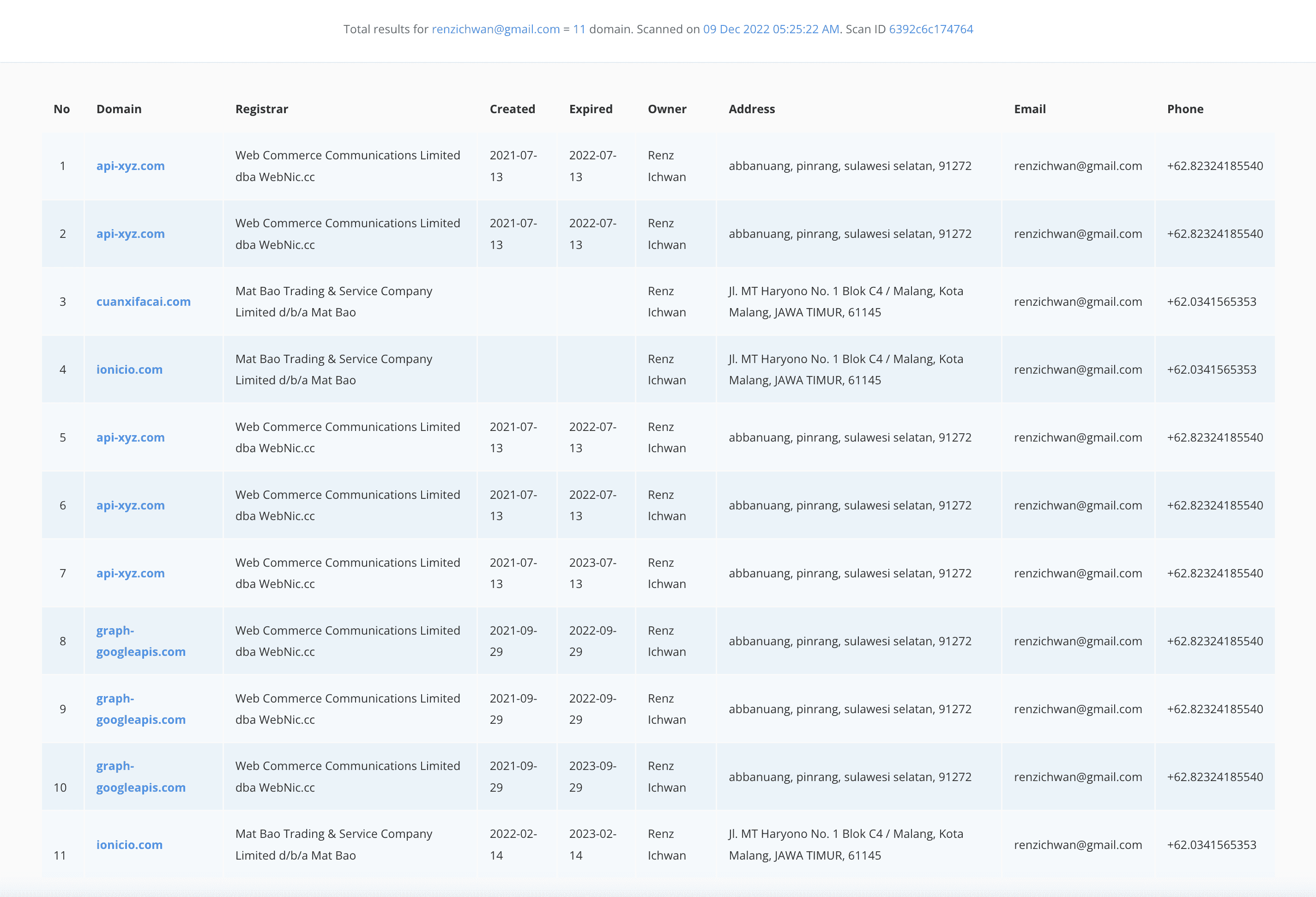 Email : renzichwan@gmail.comProses selanjutnya yang bisa kita lakukan adalah memeriksa berapa banyak domain yang dimiliki dan dikelola oleh pelaku menggunakan email yang terdaftar di atas menggunakan osint.sh/reversewhois